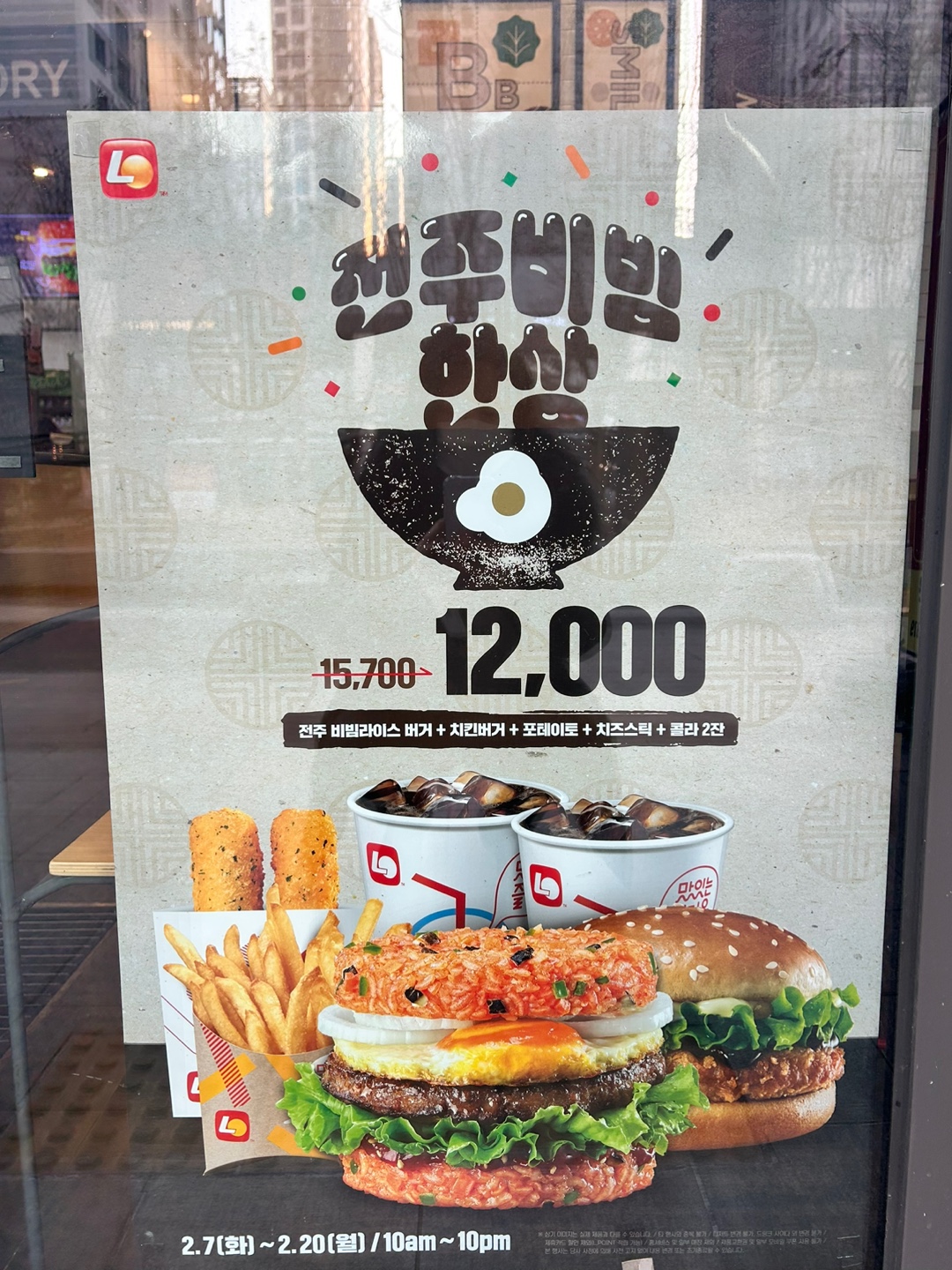 롯데리아 런치타임(오전 11시~오후 2시)에 가면 롯데리아 전주비빔라이스버거뿐 아니라 다양한 메뉴가 할인가격으로 판매되고 있다.